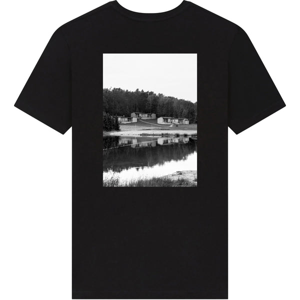 - Schwarzes T-Shirt – zeitloser Klassiker mit ikonischem RE:PRINT Design vom Bungalowdorf Olganitz, fair produziert in Europa